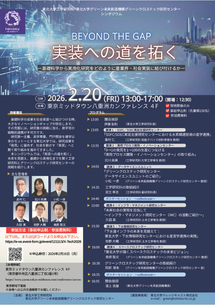 【東北大学】工学研究科×グリーン未来創造機構グリーンクロステック研究センターシンポジウムを2月20日(金)に東京ミッドタウン八重洲にて開催します。